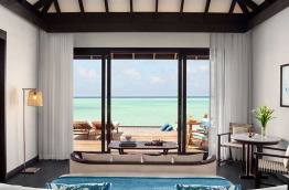 10 Over Water Pool Villas, sur pilotis, mesurent environ 97 m2, en comptant les 43 m2 de terrasse. Elles offrent bien-sûr la vue sur la mer, ainsi qu’une piscine privative pour que vous puissiez combiner eau douce et eau salée.