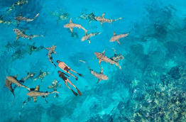 9 Over Water Villas d’environ 56 m2 sont construites sur pilotis au-dessus de la surface du lagon. Le décor est naturel : plancher en bois, toit en feuilles de palmes et tissus à motifs colorés… Votre terrasse privée donne sur la mer, et offre un accès direct au lagon ; elle est équipée d’une table et d’un canapé.
