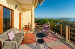 5 Deluxe Beach View en rez-de-jardin offrent une salle de bains plus spacieuse et une grande terrasse. A l’étage supérieur, les 5 chambres Deluxe Sea View sont identiques mais avec un grand balcon et une vue dégagée sur l’océan.