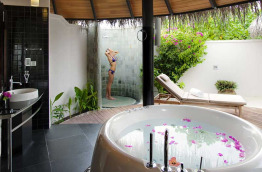 40 Water Villas de 85 m2, construites sur pilotis au Nord-Est de l’île. Vous pourrez rejoindre le lagon directement de votre terrasse. Tout est ouvert sur l’extérieur afin que vous profitiez de l’environnement. La salle de bains intérieure d’où vous pourrez admirer le lagon, comprend une baignoire hydro-massante et une douche ouverte sur l’extérieur.