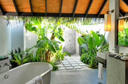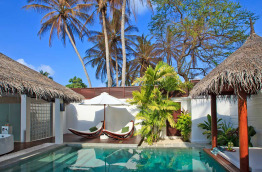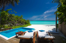 30 Beach Villas with Pool de 116 m2 sont positionnées directement face à la mer. La grande salle de bains semi-ouverte possède une douche dans le jardinet privatif, ainsi qu’une baignoire et une seconde douche en intérieur. Pour votre détente, vous bénéficiez aussi d’une confortable terrasse et d’une petite piscine privative de 4,5 m2.