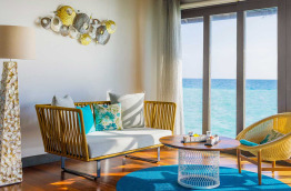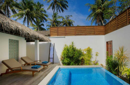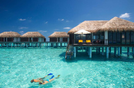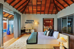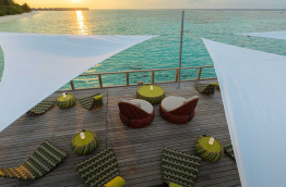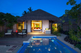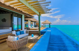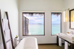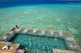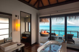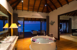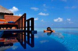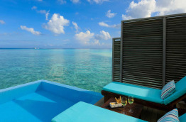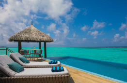 17 Water Bungalows with Pool de 80 m2 sont construits sur pilotis au-dessus du lagon, sur la jetée Est qui fait face à Male. Ils sont équipés d’un système hi-fi, et d’une salle de bains intérieure avec douche et baignoire. Vous disposez d’une belle vue sur la mer depuis la salle de bains, et d’un accès direct au lagon depuis la grande terrasse, également équipée d’un petit bassin carré de près de 4 m2.
