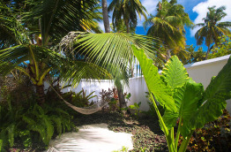 4 Deluxe Bungalows de 70 m2 sont installés dans les jardins face à la plage. La vue est brouillée par la végétation. Chacun possède une salle de bains avec baignoire et douche extérieure et intérieure. Ils donnent sur une terrasse privative équipée de transats pour vos bains de soleil.