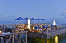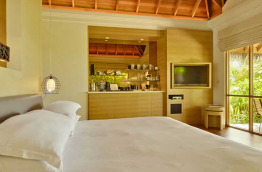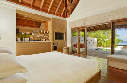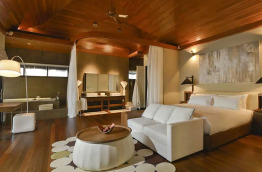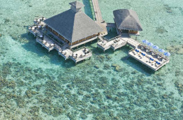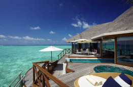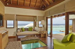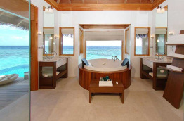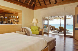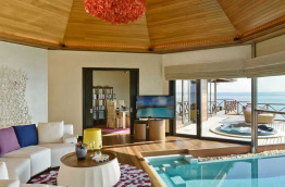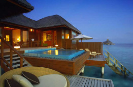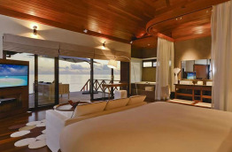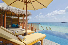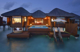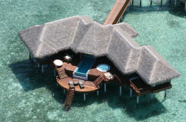 2 Two Bedroom Ocean Pavilions with Pool de 330 m2, face au soleil couchant. Ici, on vous assure calme et intimité car les villas sont situées au bout de leur jetée privée. Elles comprennent deux chambres à coucher, un salon, une salle à manger, une grande terrasse sur deux niveaux équipée de bains de soleil, et une piscine à débordement qui commence dans votre salon. Un majordome est à votre service 24h/24.