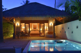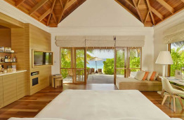 12 Ocean Bungalow with Pool de 160 m2, également sur pilotis mais tournés vers le plein océan, au soleil couchant. Plus spacieux, la terrasse sur trois niveaux est équipée d'un coin repos, de chaises longues, et d'une petite piscine. A l'intérieur, le confort est extrême, avec coin salon, salle à manger. La mer est visible de partout, même dans le sol. Vous ne saurez plus où vous poser tellement vous bénéficiez de coins de repos agréables, à l’ombre ou au soleil.