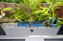 8 Beach Bungalow with Pool de 125 m2, face à la plage, comprenant une salle de bains ouverte sur l’extérieur avec douche et baignoire, et une petite piscine dans un jardinet privé. Une terrasse en bois fait face à la mer, elle est équipée d'un coin repos très confortable et d'une table.