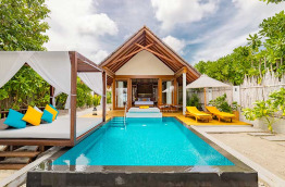 Les 10 Beach Pool Villas avec bain à jets d’environ 200 m2 se trouvent sur la côte Est de l’île. Leur architecture rappelle le design d’un bateau traditionnel maldivien du même nom, et leur salle de bains entièrement vitrée donne sur un jardin privé. Ces villas sont entourées d’une végétation luxuriante d’un côté, et offrent une vue sur le sable blanc et le lagon de l’autre. Elles sont aussi équipées d’une piscine privée en forme de gouvernail de dhoni, ainsi que d’un bain à jets extérieur.