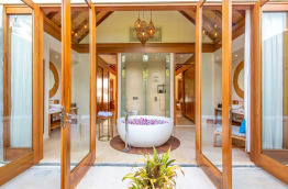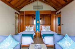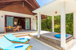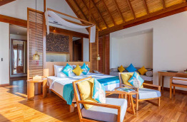 Le long de la plage Nord de l’île se trouvent 40 Beach Villas. Elles disposent d’un agréable lit king-size installé face à la baie vitrée. Sur votre terrasse privée, profitez de chaises longues et d’une table à l’ombre des palmiers. La salle de bains semi-extérieure est très agréable, avec sa douche et sa grande baignoire. Cette villa d’environ 125 m2 peut accueillir 2 adultes et 2 enfants ou 3 adultes.
