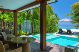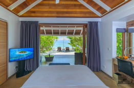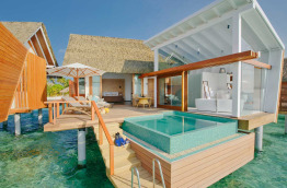 4 Deluxe Ocean Pool Villas de 120 m2, sont construites sur une jetée en arc de cercle sur pilotis au-dessus du lagon. Elles comprennent une belle chambre largement ouverte sur l’extérieur. La salle de bains fait également face au lagon, et comprend un bain à jets, et une douche, ainsi qu’un dressing. Une terrasse extérieure est équipée de bains de soleil, et d’un escalier qui mène directement au lagon.