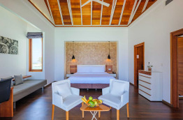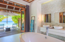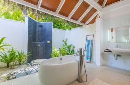 7 Ocean Pool Villas de 90 m2 qui sont les plus belles villas de Kandolhu. La terrasse est aménagée avec un escalier vers le lagon, ainsi qu’une petite piscine de 7 m2. La salle de bains est très claire, largement ouverte sur le lagon, et bénéficie d’une baignoire et d’une douche. La chambre est spacieuse et luxueuse.