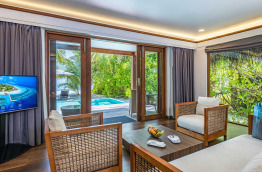 8 Duplex Pool Villas de 150 m2 sur la plage Ouest de Kandolhu. Elles sont construites sur deux niveaux, la chambre étant au niveau supérieur. Celle-ci bénéficie d’une petite salle de bains et d’un balcon aménagé afin que vous puissiez profiter de la vue panoramique. Au rez-de-plage, le salon est confortablement aménagé et peut accueillir une troisième personne. Une seconde salle de bains est semi-ouverte avec douche et bain, puis une douche extérieure. La villa est également équipée d’un généreux dressing, d’une terrasse bien équipée d’un coin repas, un coin salon, et une piscine de 18 m2.