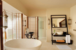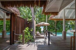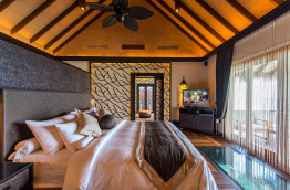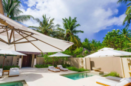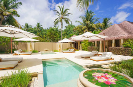 33 Beach Villas with Pool d’environ 103 m2 sont situées directement sur la plage, sur la côte Est de l’île. Elles comprennent une chambre, une salle de bains avec douche extérieure et baignoire, et une terrasse donnant sur une petite piscine privative.