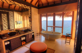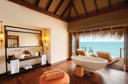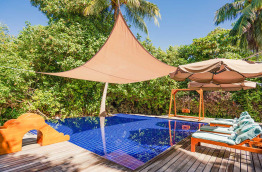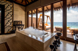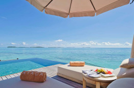 33 Ocean Villas with Pool sont construites sur pilotis et mesurent environ 108 m2. Elles se trouvent sur le ponton le plus à l’Est, et sont tournées vers le lever de soleil. Elles sont composées d’une chambre, d’une salle de bains avec douche et baignoire, et d’une terrasse aménagée avec une piscine privative et un hamac suspendu au-dessus du lagon.