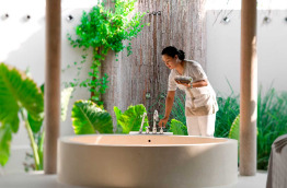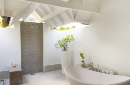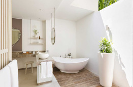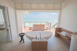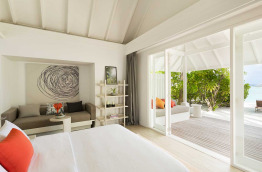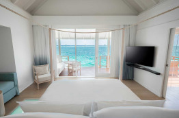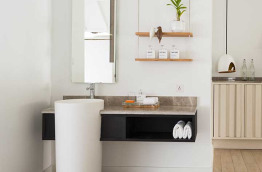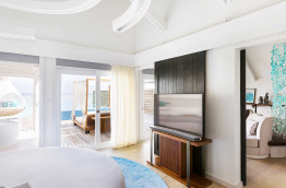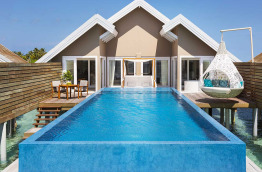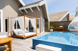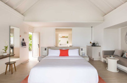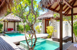 46 Romantic Pool Water Villas (Villa Pilotis Romantique avec piscine) de 110 m2 à la déco chic et contemporaine dans un style maison de plage moderne. Elles sont pourvues des équipements les plus récents, une terrasse avec piscine privée et douche extérieure, et un accès direct à la mer. Cette villa ne bénéficie pas de baignoire mais d’une double douche.