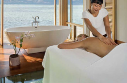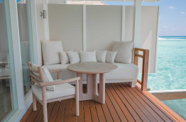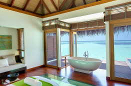 Les villas sur pilotis offrent toutes une salle de bains intérieure d’où vous pourrez profiter d’une magnifique vue sur la mer, et d’une terrasse aménagée offrant un accès direct au lagon.