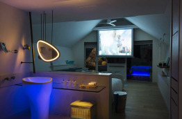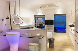 Enfin, 1 LUX* Villa de 360 m2. Elle est située tout au bout de la jetée avec une vue panoramique sur le lagon. Elle dispose de deux chambres avec salle de bains, une kitchenette, une piscine à débordement et une immense terrasse. Au centre du salon, tel un aquarium grandeur nature, le sol s’ouvre sur les fonds marins.