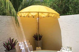 14 Earth Villas de 185 m2 qui sont situées sur le côté Est de l’île, nichées dans la végétation. Les Earth Villas sont vraiment bien protégées par la végétation afin d’assurer votre intimité. La salle de bains comprend deux vasques, les toilettes séparées et la penderie. Dans un jardinet clos sur l’arrière de la villa, en plein air, vous trouverez une douche et une baignoire. Vous pourrez profiter de l’ombre dans le confort de votre sofa sur la terrasse, ou sur les chaises longues que vous pourrez mettre sur la plage pour profiter du bruit des vagues.