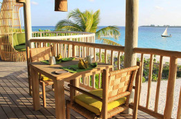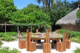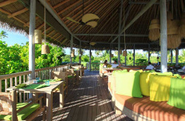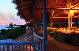 Le restaurant Leaf prépare une cuisine à base de produits frais du jardin de l’hôtel ou des villages de l’atoll, ainsi que de poissons fraîchement pêchés. C’est le seul restaurant sur la terre ferme, il est perché au-dessus du jardin bio au centre de l’île.