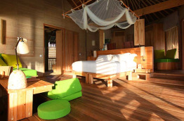 70 Water Villas de 108 m2 comprenant de grands espaces extérieurs pour profiter de la mer et du soleil, dont une plate-forme en filet au-dessus de l’eau, et un grand coin salon ombragé très moelleux, sans oublier les transats pour vos bains de soleil, juste au-dessus de l’eau. La salle de bains est équipée d’une belle douche de plein air, chose rare dans les villas sur pilotis, et d’une baignoire qui vous offre une vue panoramique sur l’océan.